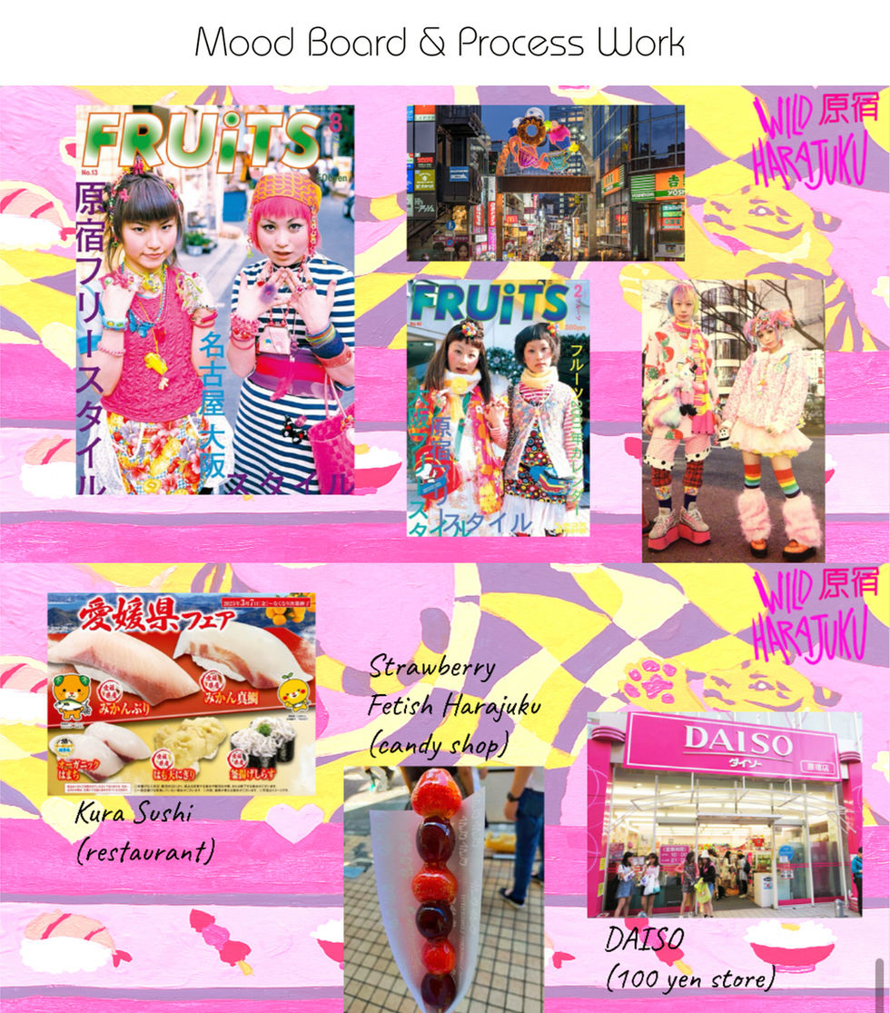 My aim was to design a scarf pattern that celebrates how the Harajuku Station in Japan came to be known as the fashion capital of the entire island. The bright and playful look of Harajuku's very own street fashion, with colorful foods and vibrant stores, are just begging to be captured into repeat. Using twelve colors representing the energy of the culture, I honor the wild self expression of Harajuku style.